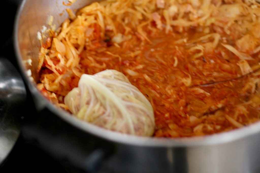 Place the assembled cabbages on top of the prepared sour kraut mixture from earlier one by one, fitting each leaf snug next to each other. Place the remaining 1 lb sour-kraut on top of the stuffed cabbages.