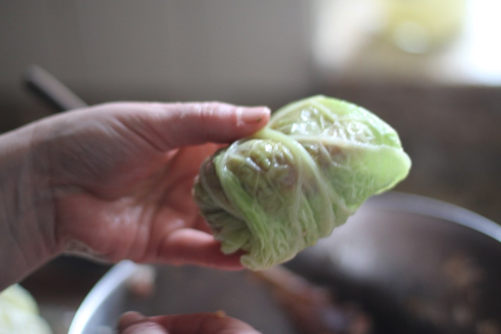 Pour the meat stock over the stuffed cabbage leaves. Make sure the liquid covers everything in the pot. Bring to a boil and turn the heat down. Cook on very low heat slowly covered for 1 ½-2 hours or until the cabbage and the stuffing are cooked.