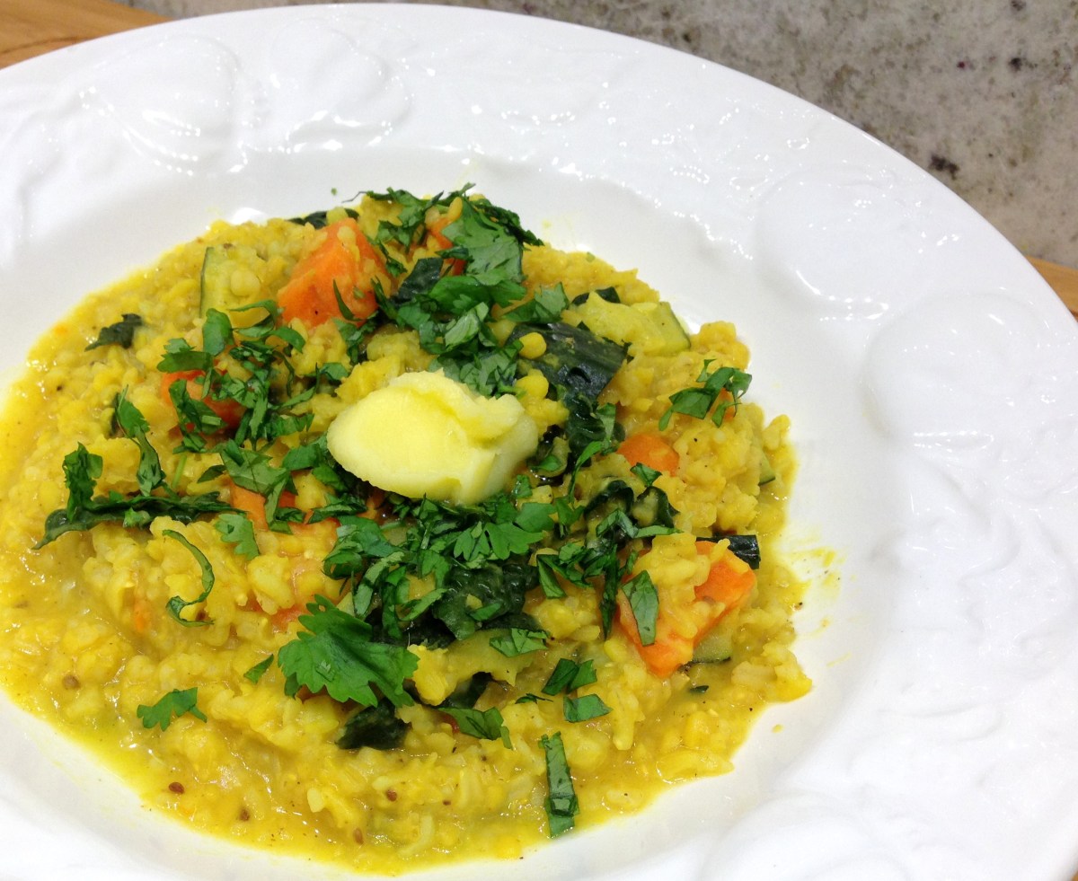 I like to turn to the ancient Ayurveda cooking, in other words Indian cuisine! Most people associate Indian foods with something exotic. Yes, some of their dishes can be foreign to us, but their nourishing dish, the Kitchari can be made any time, anywhere and surely by anybody. Really, Indians make it on a regular basis, serve it during holidays with the rich foods to help their digestion and even give it to sick people to recover from an illness. It is an inexpensive dish that millions eat on a daily basis in India. I asked my Ayurveda teacher if we could eat it during the cold season. She said yes even when it is -40F – just add the warming spices like ginger, cumin, and hot pepper. You can serve local vegetables like carrots, spinach, kale, cauliflower, onions etc. Of course, it would go nicely with some Indian rice and roti.