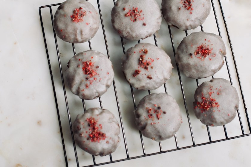 7. To decorate (if desired): While the glaze is still wet, top cookies with a small pinch of peppercorns and the edible glitter.