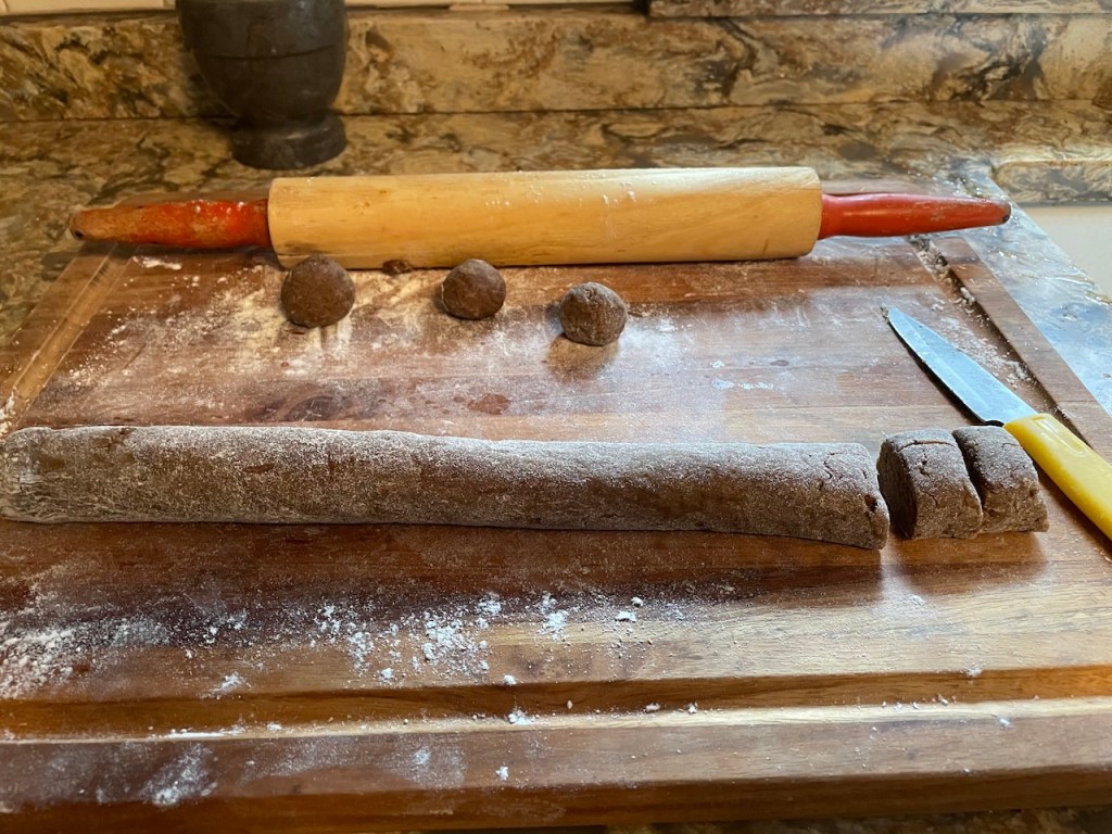 4. Work in a cool space, maybe open the window. Remove the dough from the plastic wrap and immediately roll it into two strands, each 3/4 inch thick. Slice the rolls into 3/4 inch thick rounds and roll each round into a ball (each ball be about 3/4 inch large). Note: You can make them any size. Place the balls on the prepared baking sheet. Repeat process with remaining dough, spacing balls 1 1/2 inches apart. (Try to do this step as fast as possible so the dough doesn’t get too warm).