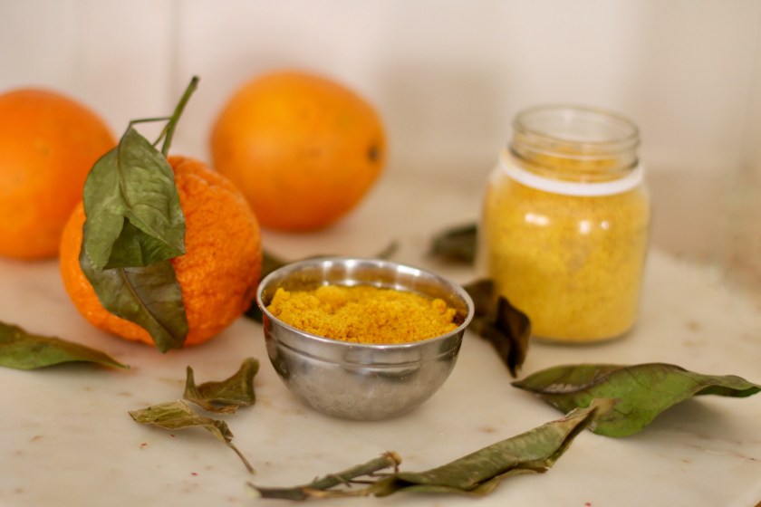 1. Carefully peel an orange. Remove any wet, fleshy parts that might have stayed on the peel. Place the peels on a paper towel in a single layer and put them in a dry place. The top of the cupboard is great. Don’t layer them as they can get soggy. Dry them for 1 month.