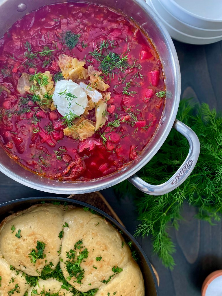Borscht is a traditional Ukrainian dish and is popular all over Eastern Europe. This iconic soup is made with hardy root vegetables: potatoes, beets and carrots. It gets its gorgeous red color from the beets. At the end, cabbage, garlic and beans are added. Put a dollop of sour cream and chopped dill in the soup. Traditionally, it is also served with Pampusky.