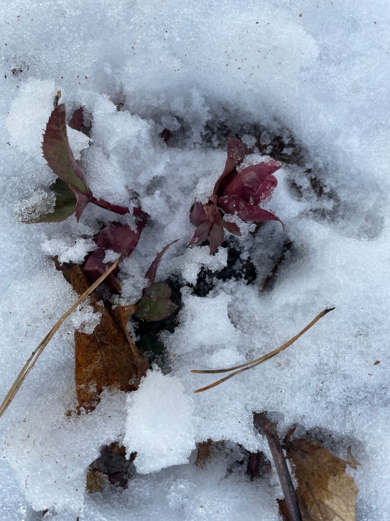 the Hellebore flowers are peaking through the snow,