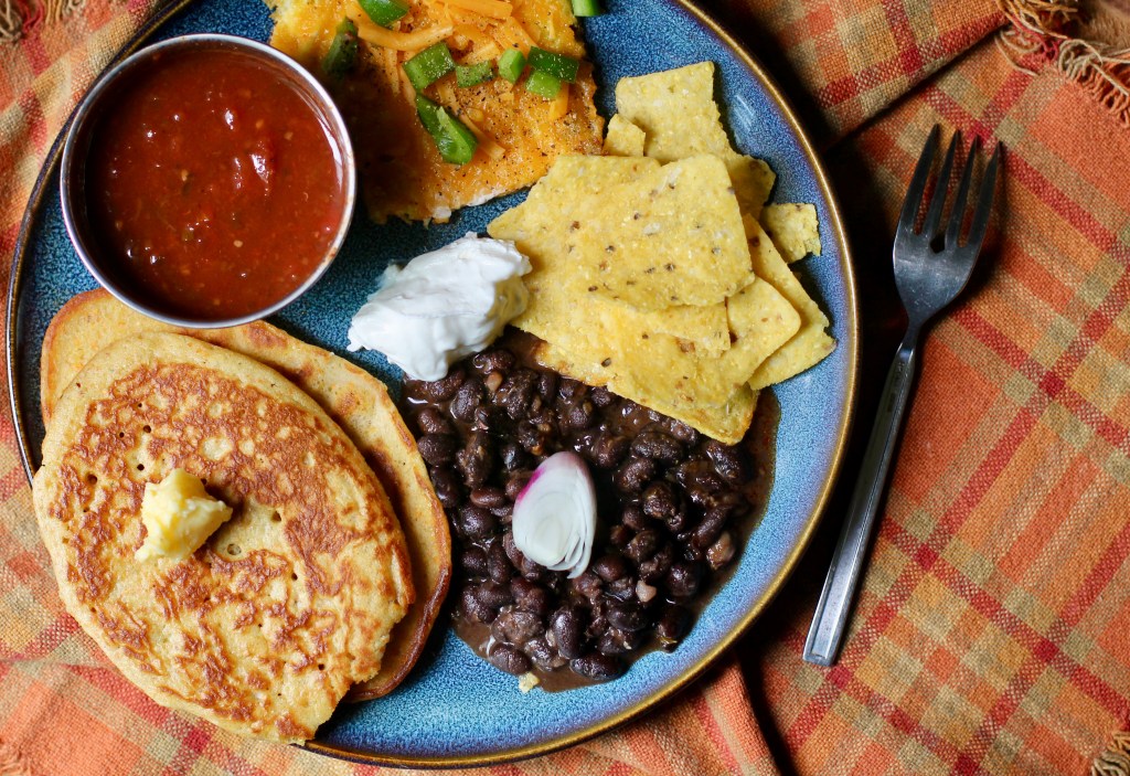 Somethin’ from nothin‘ … In Spain, Migas is a word for something from nothing, a nourishing peasant breakfast made with stale bread and ham that gives a flavorful experience. I was inspired by the Mexican version of this original Spanish dish. In Mexico, this dish is also called Migas but it is served with scrambled eggs mixed with crispy crumbled corn tortilla and black beans. I had this dish at a local restaurant called Neighborhood Cafe in St Paul, MN. It was quite the culinary experience! The Mexican chef at the restaurant served it with corn pancakes. I am not sure if the pancakes are part of the Mexican tradition but I enjoyed the whole breakfast as it was prepared at the restaurant and it is now a staple in our house.