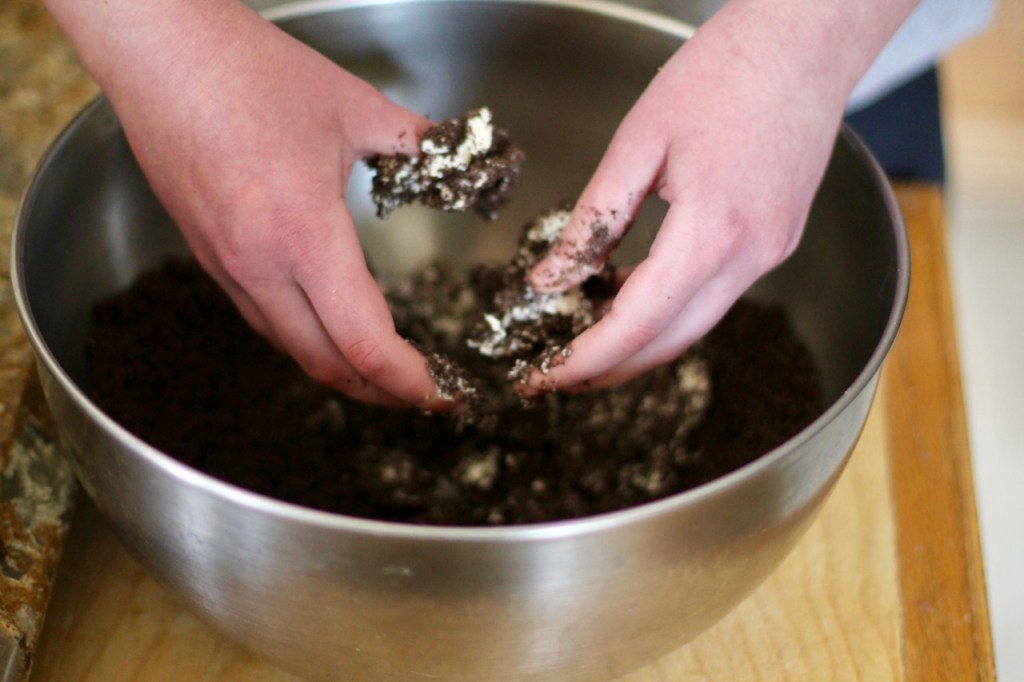 Grind the Oreo cookies into a fine powder consistency. You can use a food processor or a rolling pin.