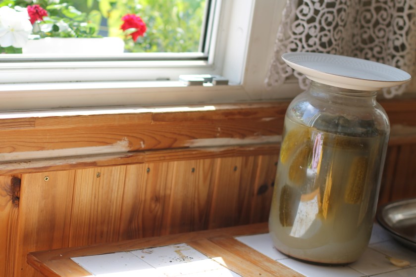 Pour in the water. You want to make sure the water covers everything including the bread on the top as well. Put a plate on top and let it sit for 3-7 days in a warm place. (In Hungary, you can see pickle jars ‘brewing’ in window seals all over the place. It is quite impressive how creative people can get who live in small places). The time will depend on the amount of heat it is exposed to. It will take 3 days on hot days but can take up to 7 days if it is cooler. You will see bubbles while the brine is ‘cooking’. Avoid hot, direct sun.