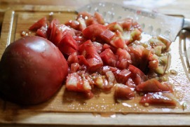 Prepare the tomato sauce for the lentils. Chop up 1 large tomato. Warm up some oil, sauté the onion for 5 minutes or until translucent. Add 2 tsp oregano, fresh thyme springs, 1/2 tsp paprika, 1/4 tsp all spice and the crushed garlic. Stir well for 1 minute and quickly add the 1 chopped tomato. Cook for 5 minutes or until tomatoes become ‘saucy’. Bring to a boil and then turn down to medium heat and add the cinnamon stick. Cook for 10 more minutes covered on low medium heat. Set aside.