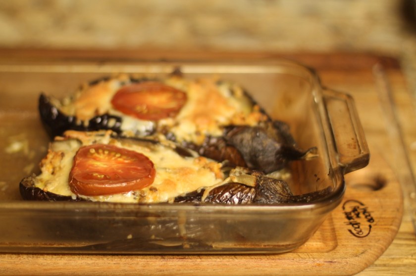 EGGPLANTS: olive oil, 1 medium sized eggplants, 1/4 cup of tomatoes sauce, 2 cloves of garlic, 1 tsp oregano, salt and black pepper.