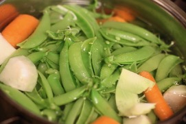 - Add the cut up yellow beans, carrot slices, bay leaves, zucchini and the stock. I like to add a yellow pepper for flavoring or at least its seed house. Cook for about 30 -45 minutes or until the beans are soft. Remove the pepper and bay leaves.