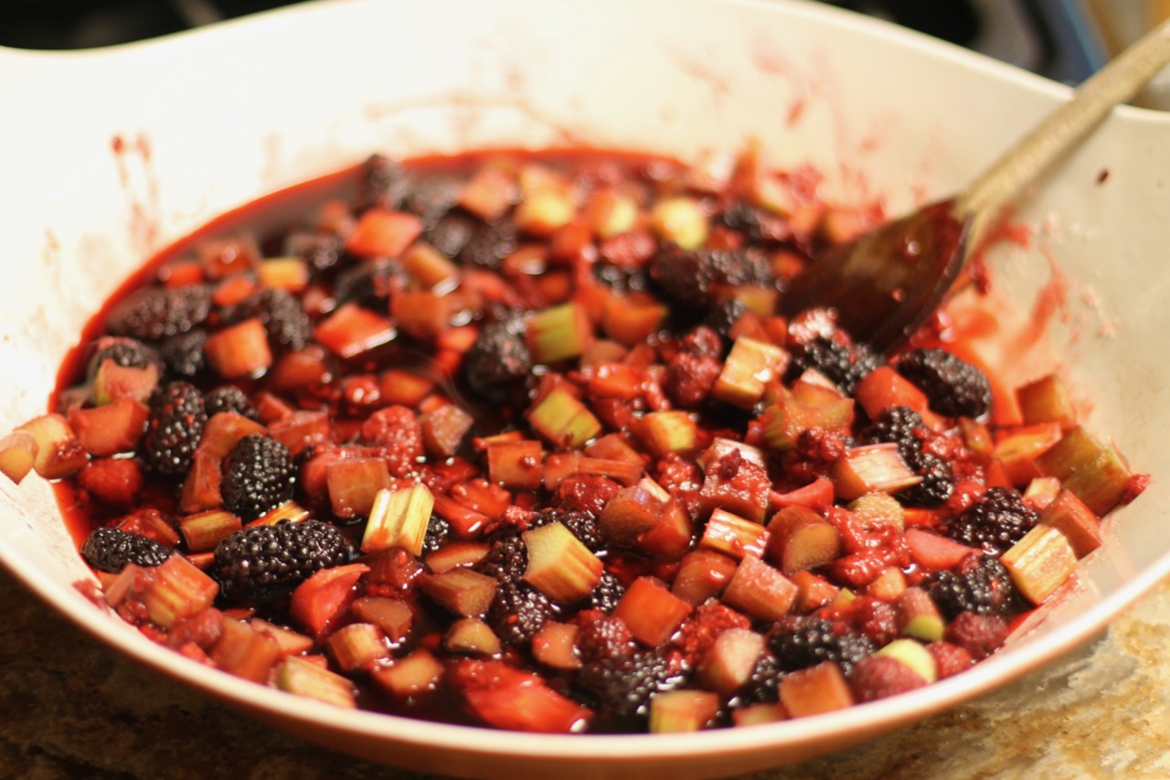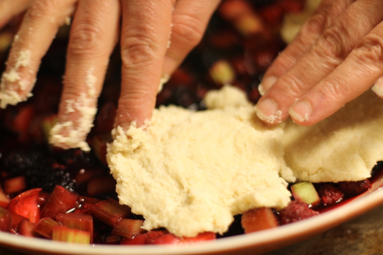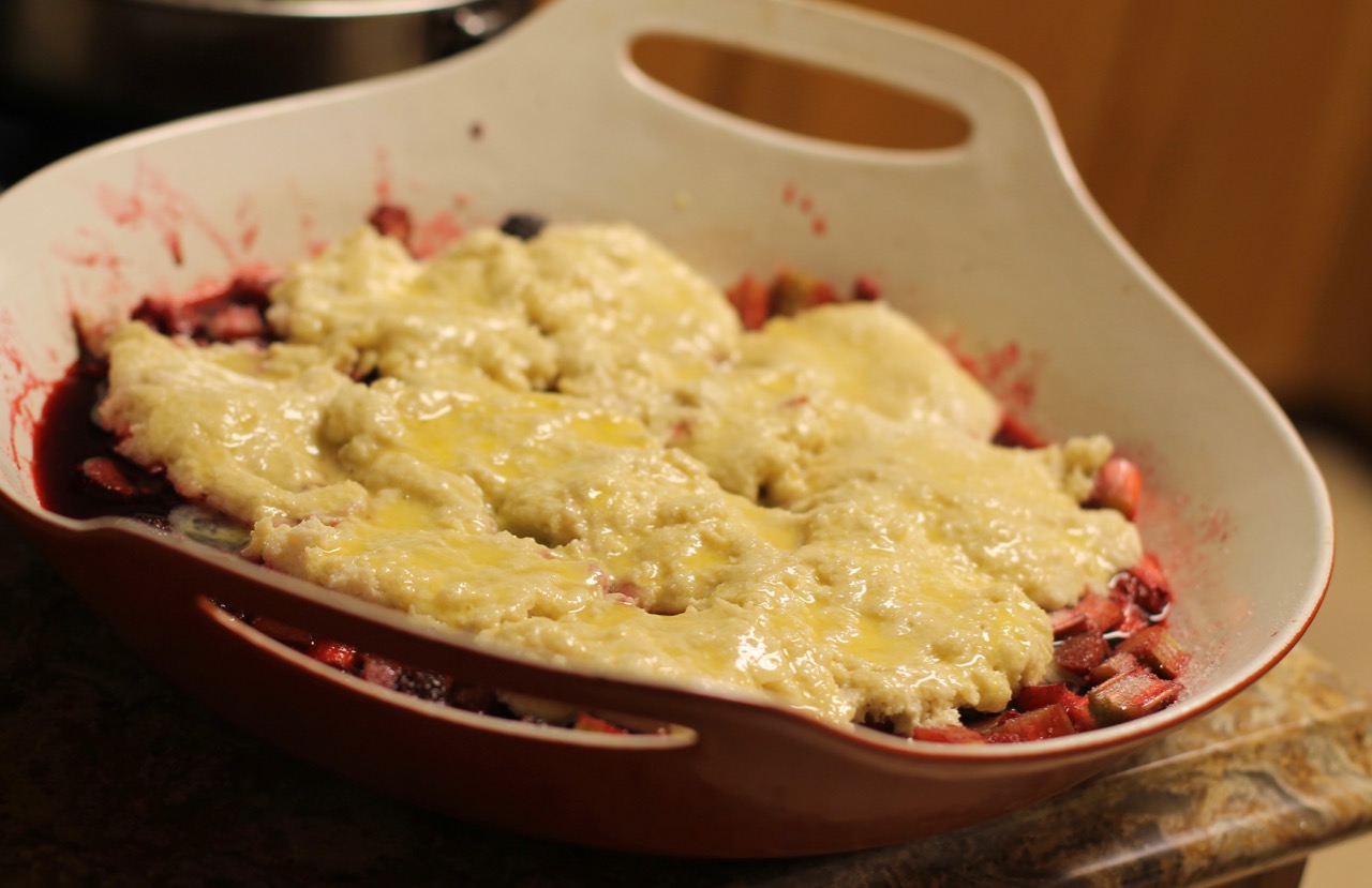 As I mentioned earlier, I like to make the cobbler with rhubarb, especially in the spring. It is the first fruit, oops I meant to say vegetable here. Yes people often think it is a fruit because of its fruity, sour taste but it is in fact a vegetable. I can’t believe I get excited about rhubarb but it is really the first new plant that shows up at the farmers market in the Midwest … and there is nothing else here for weeks. While it is not a fruit, it can be prepared with sugar to –kind of ‘cheating’- to pretend that it is a fruit. I also like to add rhubarb because the sour flavor nicely offsets the sweetness of the berries.