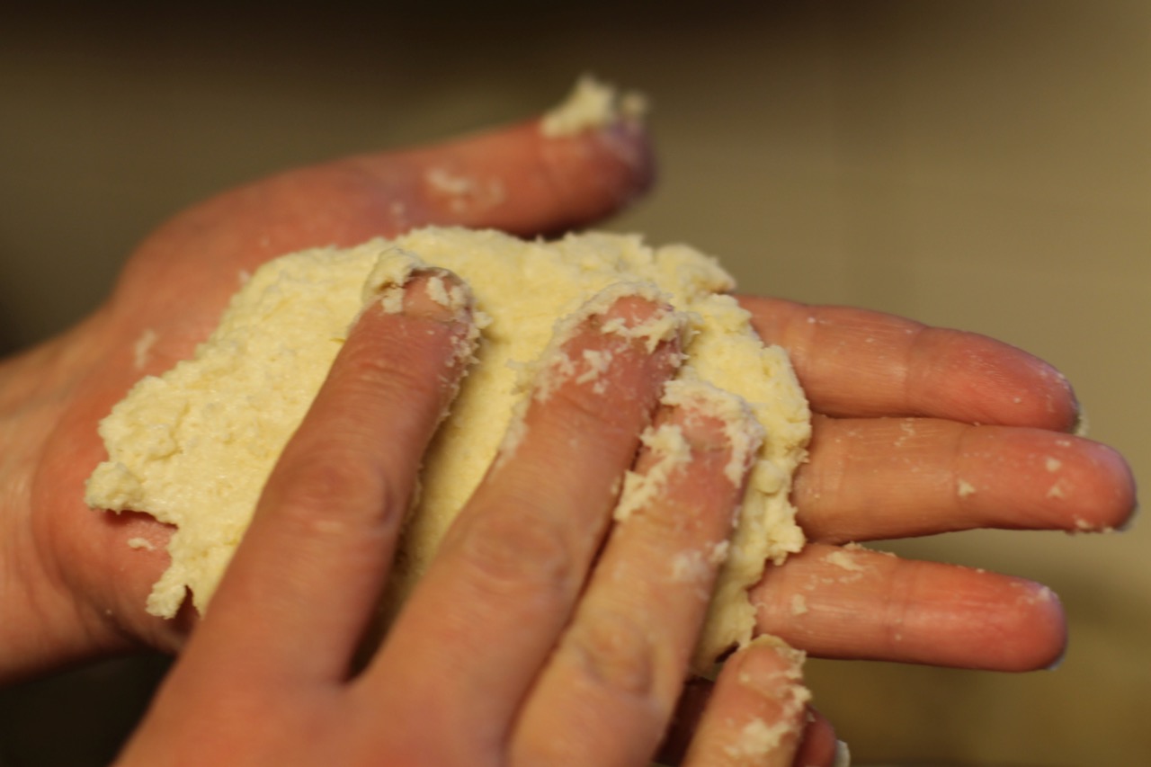 In a large bowl, combine the flour with the baking powder, pinch of salt and sugar. Add the butter with the flour mixture. This is such a satisfying experience for me to do by hand but if you prefer you can use your food processor for this step. Add the cream or milk stirring with a wooden spoon until the dough comes together. Gently need the dough in the bowl 5-10 times if needed, turning and pressing any loose pieces into the dough.